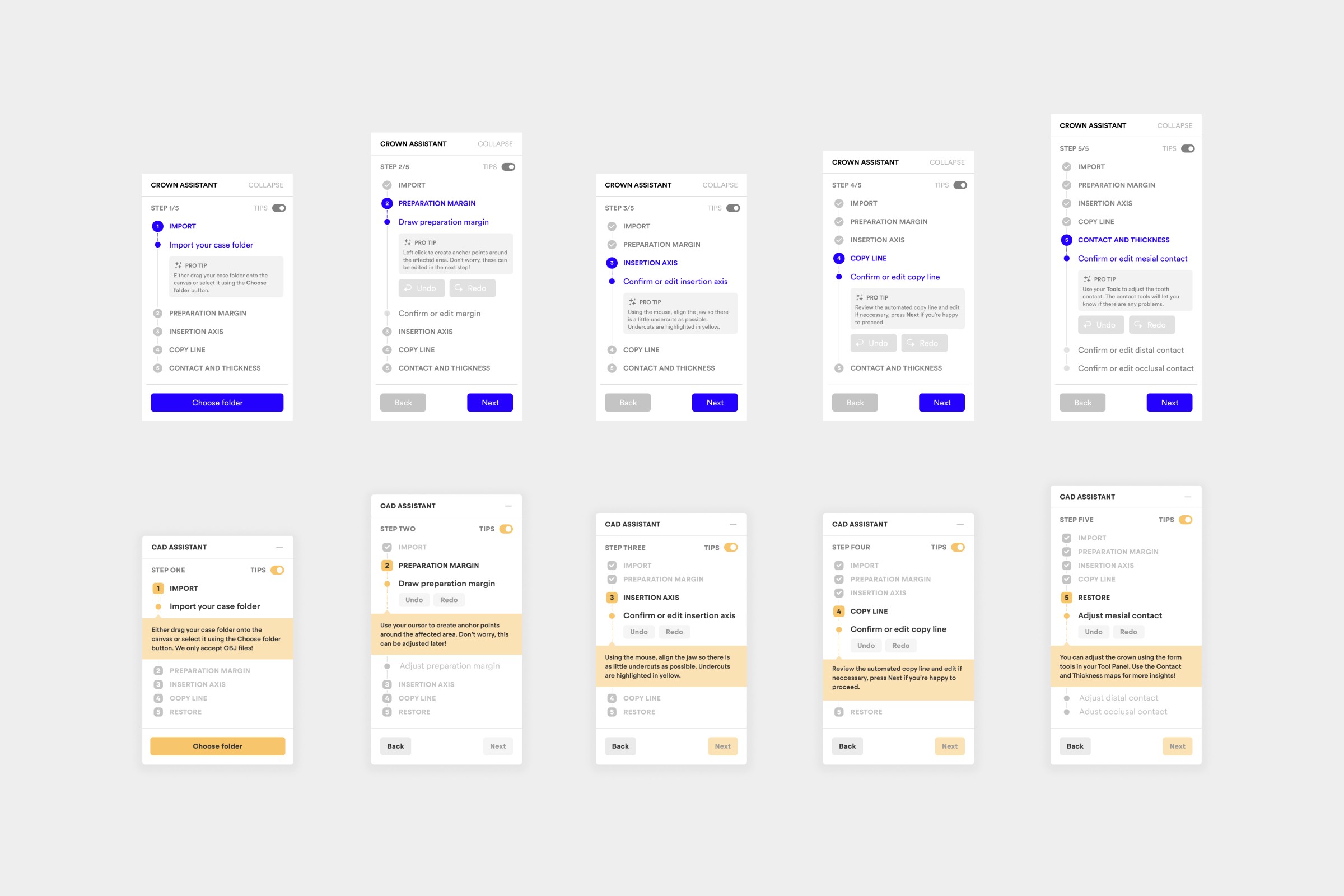 Through workshops, interviews, and on-site testing, I identified key usability barriers and reimagined the product as a five-step guided flow. The interface included AI-powered automation, interactive tooltips, and a toggleable pro mode for experienced users who wanted more control. The new interface cut design time, improved accuracy, and boosted user satisfaction across all skill levels. Clinux became a scalable, user-friendly solution that helped dental teams work faster and more efficiently—without costly training or tech upgrades.