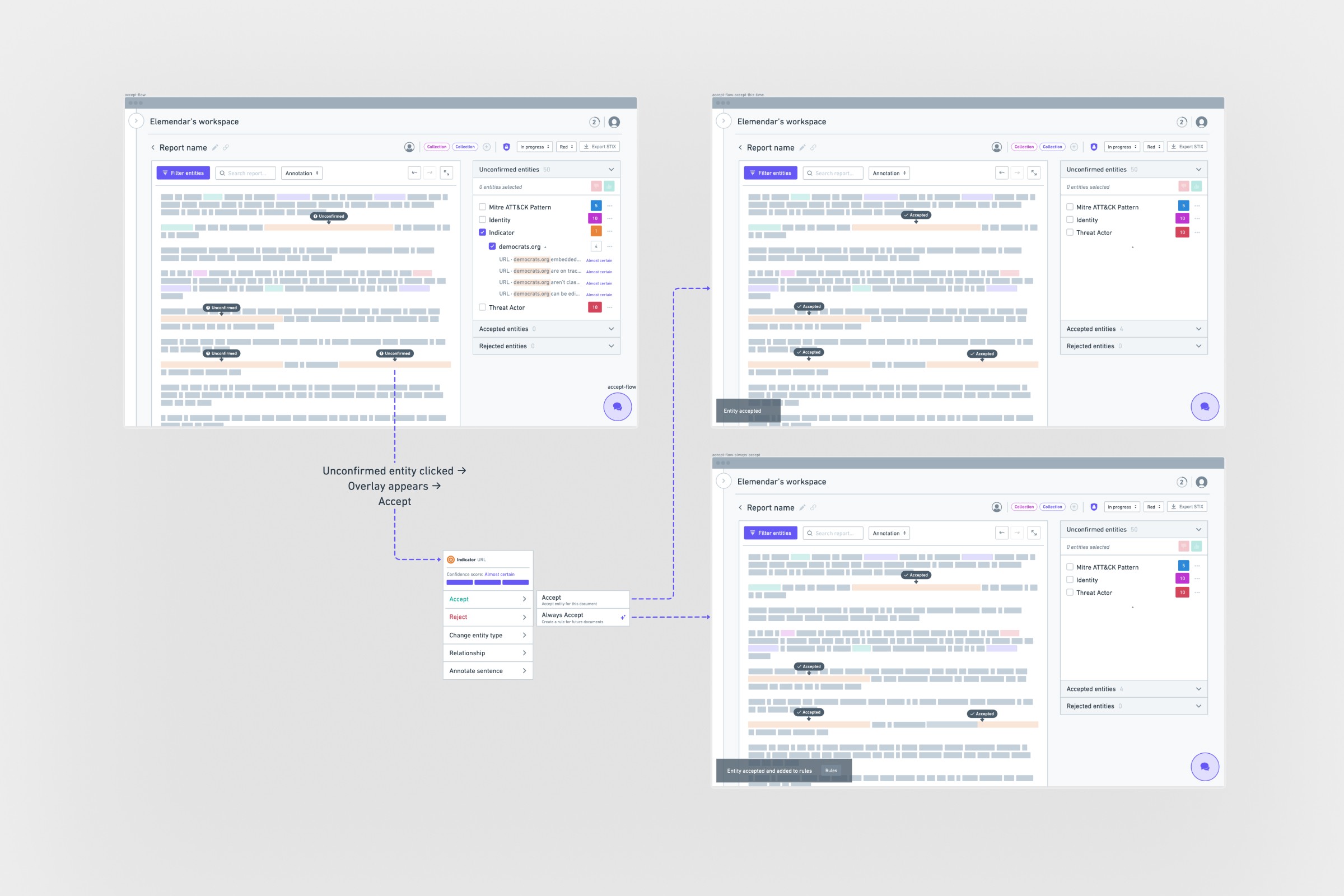 Analysts were overwhelmed by the volume of reports and hesitant to trust AI-generated annotations. The early version of READ was unintuitive and opaque, causing more friction than relief. Usability issues and lack of transparency blocked adoption, even with powerful tech behind the scenes. I worked directly with analysts to uncover pain points and redesign the interface. Features like Cascading Entities reduced manual corrections, while Manual Rules ensured annotation consistency. A new Performance Dashboard gave users visibility into the AI’s accuracy—building trust through transparency.